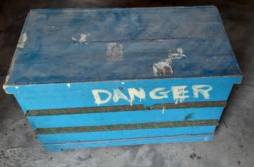 Houten kist. Blauw geverfd. Ijzeren handvatten. Slorig gedecoreerd. Weg wegens overbodig. Leuk voor te restylen. L 93cm, h 57cm, b 49cm mancave, kamp, opbergkist, terras, garage, werkhuis, .... Gratis