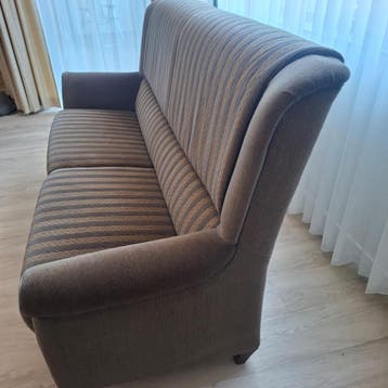 Te koop: een comfortabele tweepersoonsbank in goede staat. De bank heeft een stijlvol gestreept patroon in bruin- en beigetinten, wat zorgt voor een warme uitstraling. Ideaal voor een gezellige zithoe