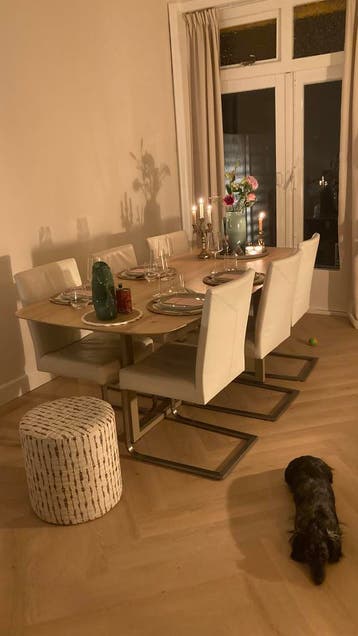 Zes mooie witte leren stoelen van piet klerkx. De stoelen zijn in goede staat, maar wel gebruikt. Ze zijn gratis af te halen.