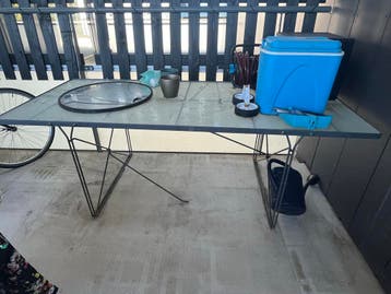 Mooie, gebruikte glastafel met een stevig metalen onderstel. Ideaal als balkontafel of voor in de tuin. Het is een massieve tafel, glasplaat is zwaar en onderstel ook. Moet schoongemaakt worden. En he