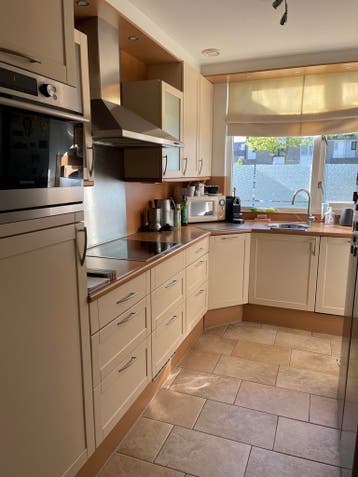 Mooie en complete hoekkeuken in crème kleur, inclusief goed werkende diverse inbouwapparatuur (inductieplaat, vaatwasser, afzuigkap). De combi-oven werkt alleen nog als oven. Maten keuken: 335 cm bij