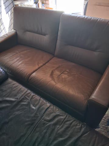 Gratis: 2 2-zitsbank van bruin leer en blauw leer. De banken zijn gebruikt. Ideaal voor jeugd/hanghok.