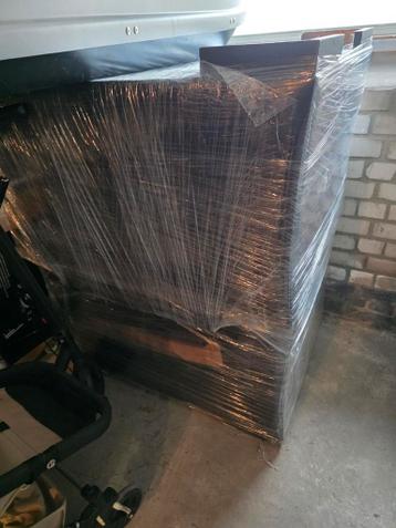 Op de tweede foto ziet u de tweezitsbank. Van dit model zijn er 2 losse éénzitters beschikbaar. De stoelen staan momenteel in de opslag en zijn ingepakt met rekfolie. Daarom zijn hun eigen foto’s niet
