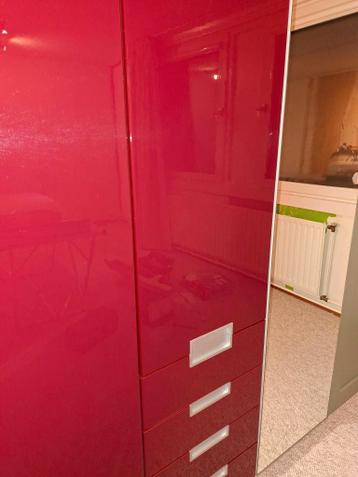 Een viertal hoge kastdeuren voor ikea pax kledingkast. Daarnaast nog een iets kleiner deurtje met 4 lades eronder. Donkerrode/paarse wijnkleur. Voorkant is glimmend. Foto's geven daardoor niet all