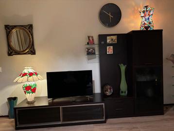 Zwart/bruine kast. Mooie glazen deurtjes van matglas. Diverse delen.