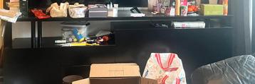 Zwart tv meubel in gebruikte staat. Heeft 2 kastjes met planken, 1 kleiner kastje zonder plank en 2 lades. Kan in 2 delen uit elka