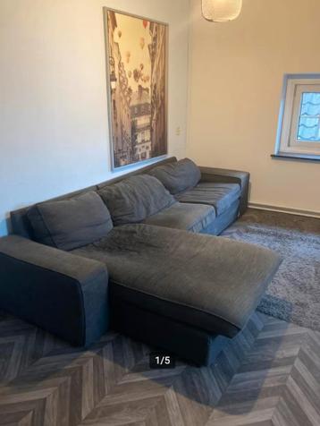 Functionele driepersoons l-vormige bank. Afmetingen: 280 cm breed, 100 cm diep (lange stuk van de l is 170cm) en 50 cm hoog. Biedt