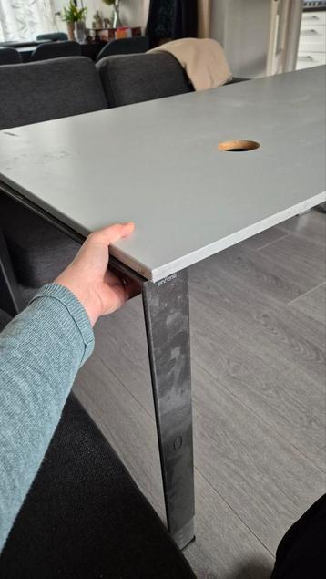 Een stevig bureau van ahrend met een lichtgrijs blad en metalen poten. Het bureau is in goede staat en ideaal voor een thuiswerkplek of kantoor. Het blad heeft enkele gaten voor kabeldoorvoer. Afmetin
