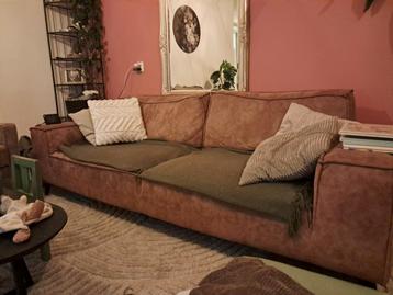 Bruine stoffen driezitter. De bank heeft gebruikerssporen, zoals schade aan de stof aan de achterzijde door verhuizen(niet zichtbaar aan voorzijde). De middelste poot onder de bank is los, maar kan bi