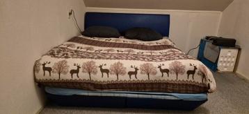 Comfortabel tweepersoonsbed met een blauw hoofdeinde. Het bed is gebruikt, maar nog in goede staat. Heeft 2 pocketvering matrassen en een topper met koudschuim. Dient van 1 hoog naar beneden getild te