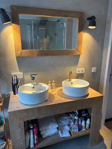 Badmeubel en bij behorende spiegel van hout. Waskommen kunnen ook overgenomen worden. Badmeubel is 1.20 Meter. Bieden vanaf 100 euro