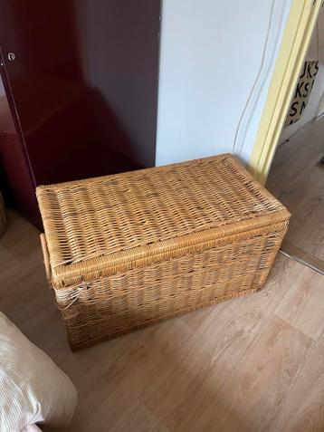 Rieten opbergmand, helaas aan 1 kant wat beschadigd door kattenkrabben. Nog steeds bruikbaar en functioneel. Zie foto's voor de schade.
