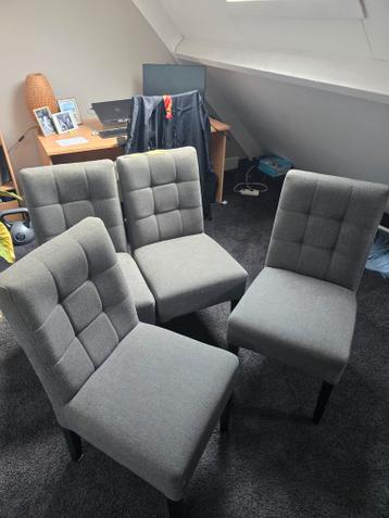 Set van vier grijze eetkamerstoelen. Zitten nog prima! Gebruikte staat, zie foto's voor details. 1 Stoel is aan de bovenkant verbrand door ovenplaat.