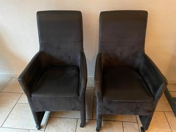 Set van 2 eetkamerstoelen met wieltjes. Ideaal voor eetkamer, vergaderruimte of kantoor. De stoelen zijn in goede staat en bieden een prettige zitervaring. Materiaal is stof en kunstleer. Kleur is don