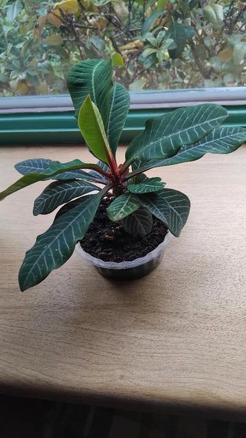Jong euphorbia leuconeura kamerplantje. Volwassen planten bloeien in de winter met onopvallende bloempjes. De planten produceren vruchtbaar zaad.