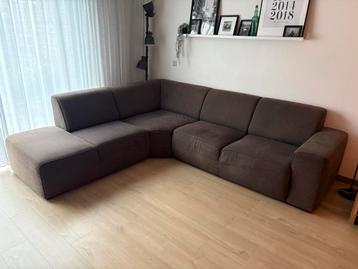 Ruime hoekbank met gebruikssporen. De bank is comfortabel en biedt veel zitruimte. Ideaal voor grote gezinnen of mensen die graag languit op de bank liggen. De bekleding is beschadigd, zie foto's.