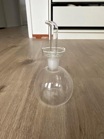 Elegant glazen flesje, perfect voor het bewaren en serveren van olie of azijn. Het flesje is in goede staat en heeft een uniek design. Ideaal voor in de keuken of op tafel.