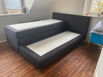 Grijze boxspring van 160x200 cm. In het hoofdbord zit een deuk, zie foto. Alleen zichtbaar wanneer je erop drukt. Nieuwprijs was 800,-. De boxspring is de afgelopen jaren weinig gebruikt als logeerbed
