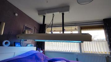 Zonnehemel met 12 buizen van 100 watt. Monteren aan het plafond. Elektrisch in hoogte te verstellen en met timer waarmee je de tijd kunt instellen zodat de zonnebank automatisch uitschakelt. Alles wer