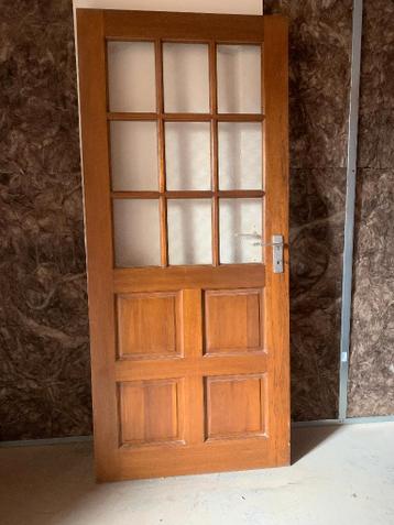 Meranti houten stompe binnendeur met glasindeling. Formaat 88x199 cm. Dikte 4 cm de deur is gebruikt maar nog steeds in prima staat (geen gebroken glas) gratis af te halen!