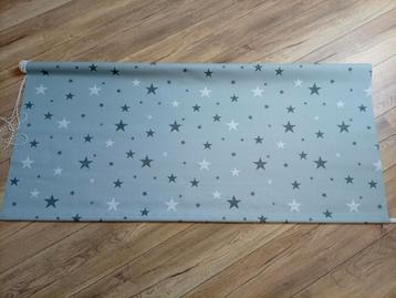 Grijs rolgordijn met sterren. Het doek is 145,5 cm breed. Totaal 148 breed. Is nog smaller te maken. Onderkant aan de achterkant w