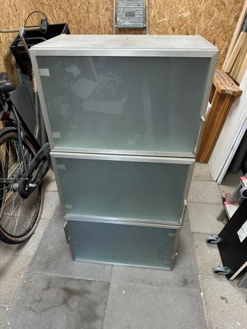 Gratis afhalen, 3 bovenkastjes afm. 60X37,5x39 cm (breedte x diepte x hoogte) met glazen deurtjes v.v. Rvs rand handig voor in de schuur of garage!