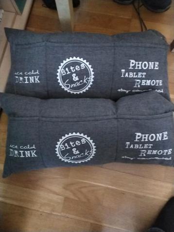 Twee grijze decoratieve kussens met opdruk en handige vakken voor bijvoorbeeld telefoon, tablet, afstandsbediening, snacks en drinken. Ideaal voor op de bank of in bed. Deze kussens kunnen alleen opge