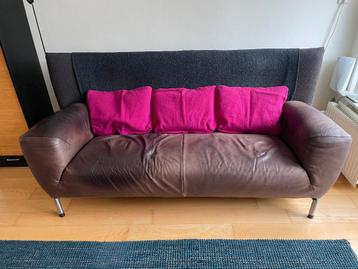 High noon 3 zits bank van ontwerper gerard van den berg (label) uit 1990'er jaren. Variant: leer (zitting) en stof (rugleuning) en verchroomde poten met kunststof zwarte dop. Oorspronkelijke cycla