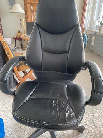 Bureau stoel die nog prima zit. Hier en daar is het leer beschadigd. Gratis ophalen samen met oud stoeltje met rieten zitting.