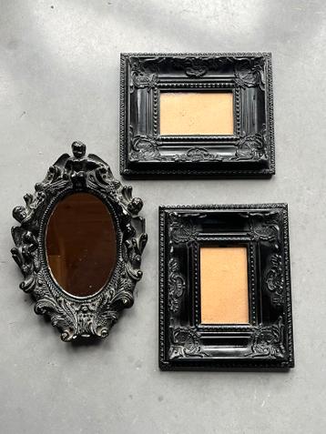 Drie zwarte fotolijstjes met sierlijke details. Gratis af te halen.