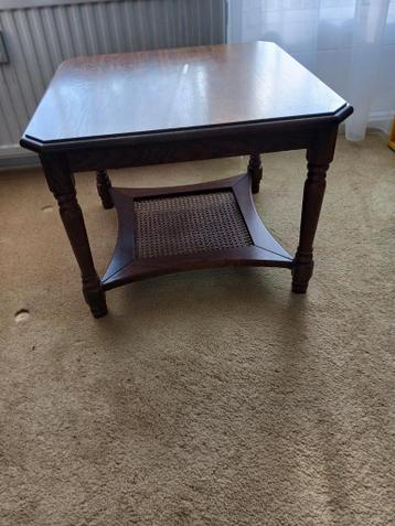 Mooie houten salontafel met een rieten plank onder het tafelblad. De tafel is in gebruikte staat en heeft een rechthoekige vorm. Het materiaal is voornamelijk hout, mogelijk eikenhout. De stijl is kla