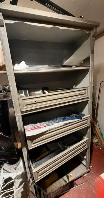 Oude, houten open kast met lades/planken grijs, 186 x 86 x 30 cm