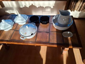 Oud lampetstel, oude soep terine, 2 zwart glazen schalen, 2 dek schalen.