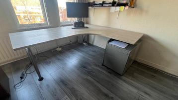 Gratis af te halen! Verstelbaar hoekbureau met stevig blad. Solide grijze poten. Afmeting: lengte lange zijde: 200 cm lengte korte zijde (rechts): 170 diepte: 80 cm het blad ziet er nog heel netjes ui