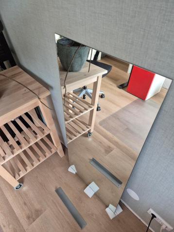 Badkamerspiegel 120 x 57,5 cm gebruikt maar kan nog prima een ronde mee. Inclusief wandplaat en houder voor verlichting.