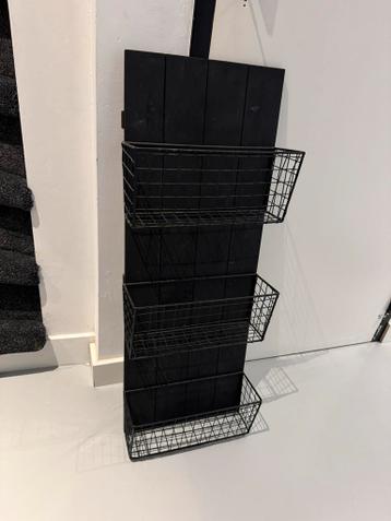 Mooi houten wandrek met 3 ijzeren mandjes. Afmetingen: lengte 87cm, breedte 31cm. In goede staat.
