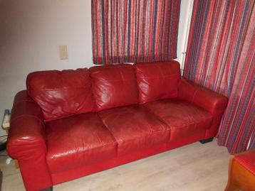 Donkerrode leren 3 zits bank. Kleur zoals op de foto's zonder flits (glimt dus óók niet). Kan een opfrisbeurtje gebruiken, qua kleur en lederverzorging. Ik kan u doorgeven welke kleurende ledercre