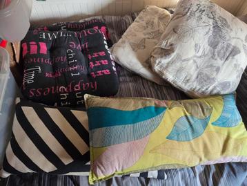 Een verzameling van diverse kussens, waaronder sierkussens met verschillende patronen en kleuren, en een comfortabel zitkussen. De kussens zijn in goede staat en kunnen een leuke toevoeging zijn aan j