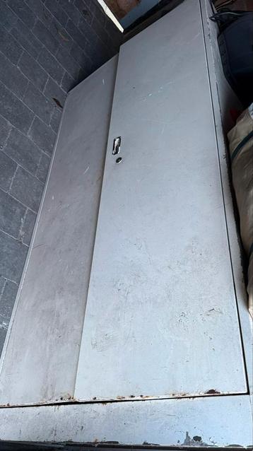 Oude metalen kast, ideaal voor opslag. Heeft gebruikssporen maar is nog functioneel. Stevige constructie. Perfect voor garage, schuur of werkplaats.