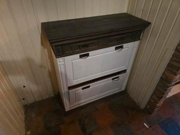 Mooie schoenenkast met twee lades. De kast is in goede staat en biedt voldoende ruimte voor schoenen. Het bovenblad is donkerbruin, de rest is wit. Ideaal voor in de hal of gang. Graag voor 19 februar