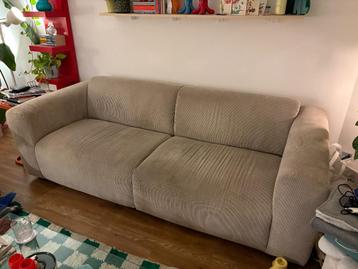 Driezitsbank van wehkamp in een beige/grijze corduroy stof. Kleine beschadigingen aan één leuning (zie foto). Gratis op te halen in amsterdam (3e verdieping).
