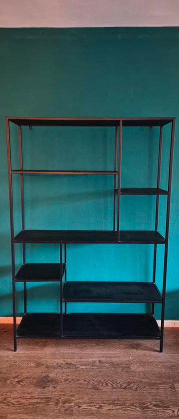 Industriële kast van staal en zwarte planken. Afmetingen 115 x 170 x 35. Gratis af te halen, zelf demonteren waar nodig.