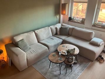Ter overname een stoffen hoekbank 4-zits. De bank is 300 x 240 cm met een zithoogte van 40 cm. Zie de laatste afbeelding voor alle afmetingen. De bank bestaat uit 2 delen, waarbij het grijze deel op d