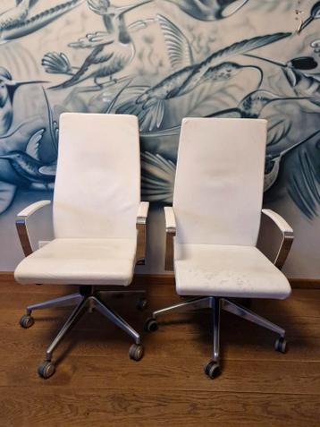 Prima bureaustoelen. Hebben gebruikersschade, maar zitten nog heerlijk. Ruggedeelte veert mee, verstelbaar. Gaan weg vanwege verbouwing.
