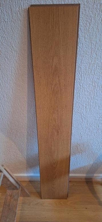 Gebruikt laminaat in de kleur/tekening licht eiken. Kan nog prima een ronde mee. In tottaal gaat het om zo'n 75 planken van 122x19 cm. Dat is een oppervlakte van +/- 17 vierkante meter. Prima voor