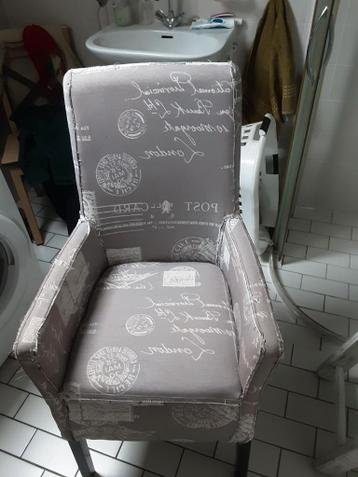 Twee mooie, comfortabele stoeltjes met een grijze stof en een print. Ze zijn in goede staat en perfect voor in de woonkamer, slaapkamer of studeerkamer. De stoelen hebben een stevig frame en zijn bekl