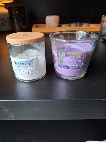 Gratis! Af te halen: twee gebruikte kaarsen. Een 'linen' geurkaars en een 'candra enchanting lavender' geurkaars. Beide kaarsen zijn bijna opgebrand, maar de glazen potten zijn nog in