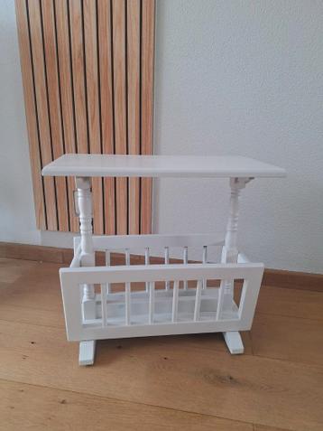 Charmant antiek bijzettafeltje, geschilderd in een neutrale kleur. Het tafeltje beschikt over een handige tijdschriftenbak, ideaal voor het opbergen van lectuur. Een uniek en functioneel meubelstuk da