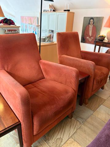 Set van twee comfortabele fauteuils bekleed met oranje/rode ribstof. De fauteuils hebben een klassiek design en zijn in goede staat. Wellicht opnieuw bekleden. Perfect voor een gezellige zithoek. Grat