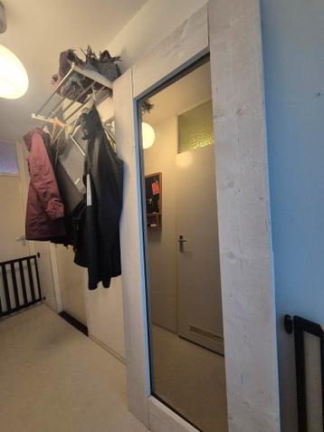 Ivm verhuizing gratis af te halen. Mooie, grote wandspiegel met een stijlvolle houten rand. Perfect om een ruimtelijk effect te creëren in je huis. De spiegel is in goede staat en klaar om opgehangen
